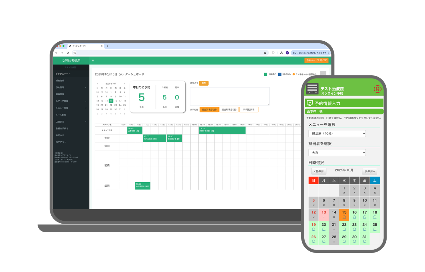 オンライン上で受け付けたいメニューと所要時間、施術するスタッフ情報を登録するとリアルタイムの空き状況が表示されます。お客さんは日時をその場で確定でき、 治療院は予約が勝手に台帳に反映され、書き写しのミスや入力漏れによるダブルブッキングから解放されます。機能面のブラッシュアップを随時続け、より使いやすいシステムに成長中です。
