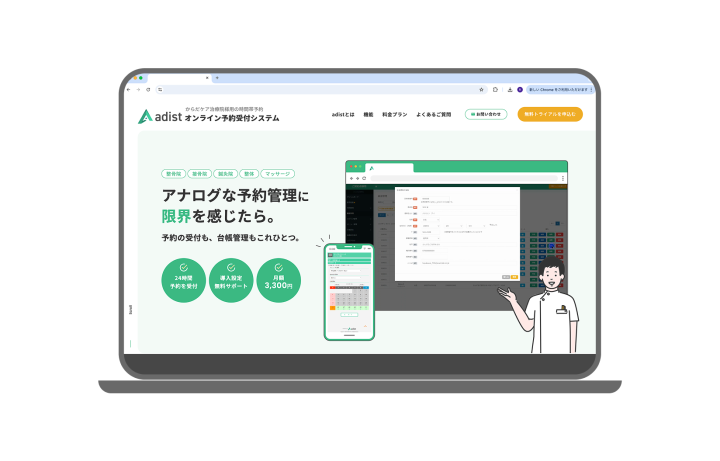接骨院、整体、鍼灸院などの治療院向けに開発したオンライン予約管理システムです。 予約管理システムはすでに多数のサービスが展開されていますが、高機能・高価格帯なので手が出しずらく、使いこなせないというお声をいただき、 これまでアナログな予約管理をしていた方も使いこなせるようなシンプルなサービスを提供するため開発いたしました。