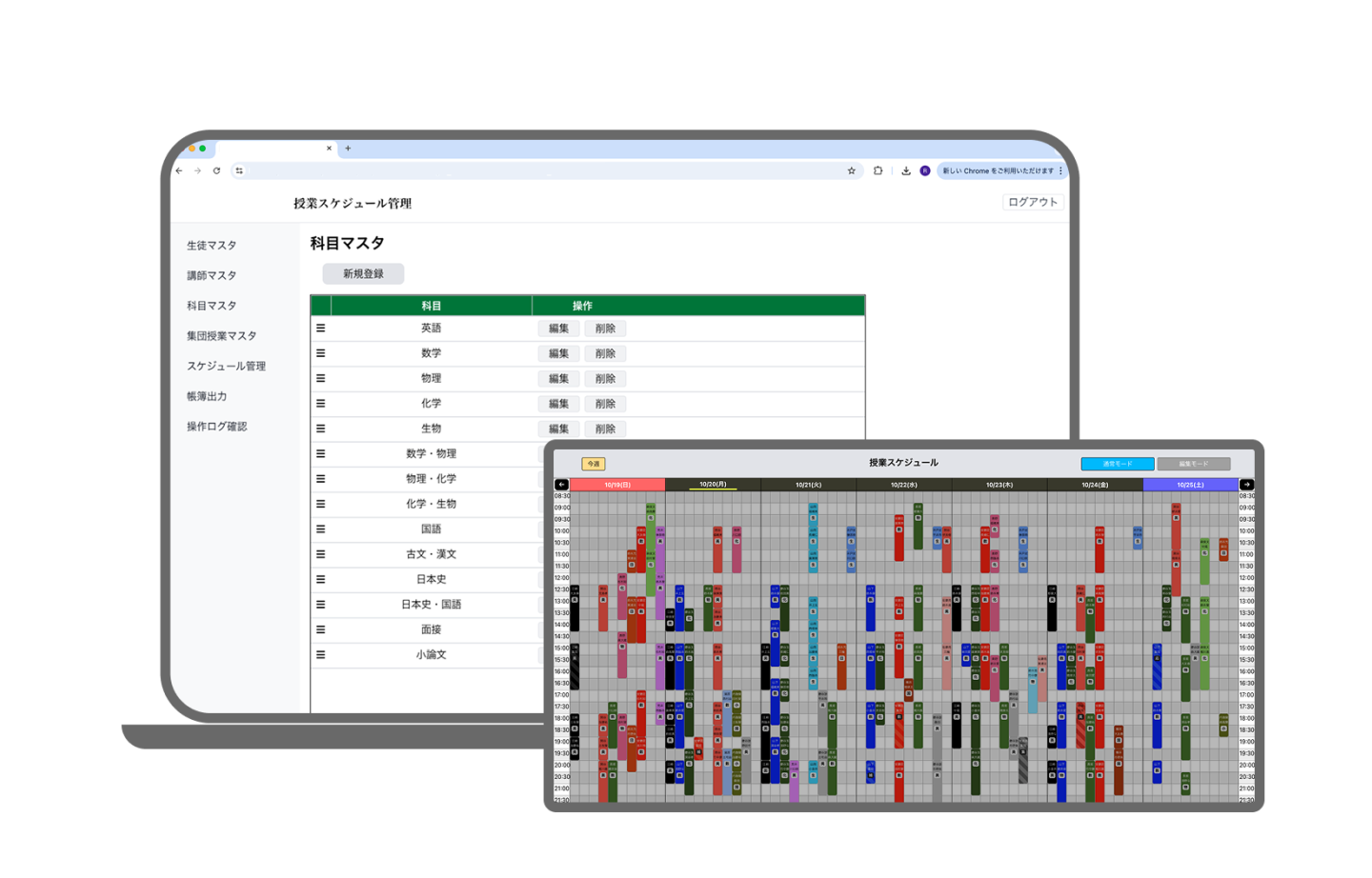 講師と生徒のスケジュール管理や、生徒ごとに月間の受講内容を集計した請求書自動発行、