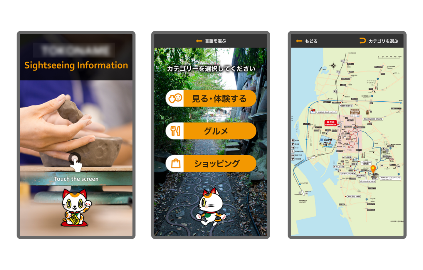 42インチタッチモニターを縦型に使用し、日/英/中/韓の言語切り替えに対応させた観光情報サイネージシステムです。観光施設をカテゴリで検索ができ、施設の詳細情報やマップを確認することが可能になっています。